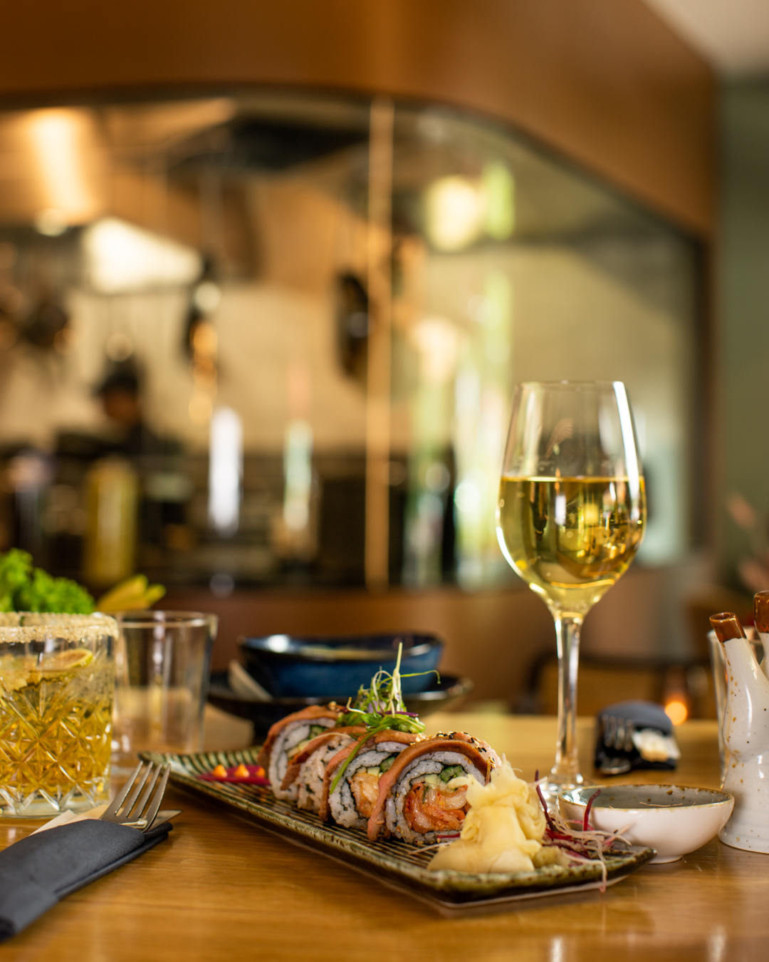 Zum Beispiel mit der Mr Hai-Roll. Eine unterarmdicke Rolle. Außen Norialgen, dann Reis, Lachs, Avocado, Gurke. Und Frischkäse! Das Ganze paniert und frittiert! Außen heiß und innen kühl, knackig, gemüsig, fischig. Was für eine Kombination, ein Spiel der Konsistenzen und Aromen. Und es ging gleich weiter mit Ebi Tempura, einer Rolle mit tempura-frittierter Garnele im Inneren und Flugfischrogen auf der Reishülle. Oder Mr Hai Fancy, mit einem Herz aus grünem Minispargel, Lachshaut, Frischkäse, Avocado, umhüllt von dünnem Lachs, der flambiert wird. Dazu sämige Unagi-Soße und Mayonnaise.